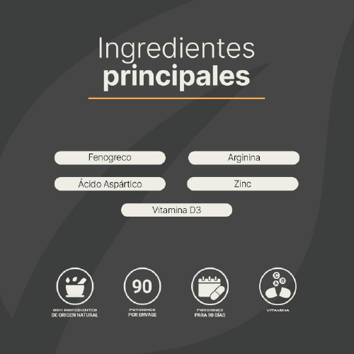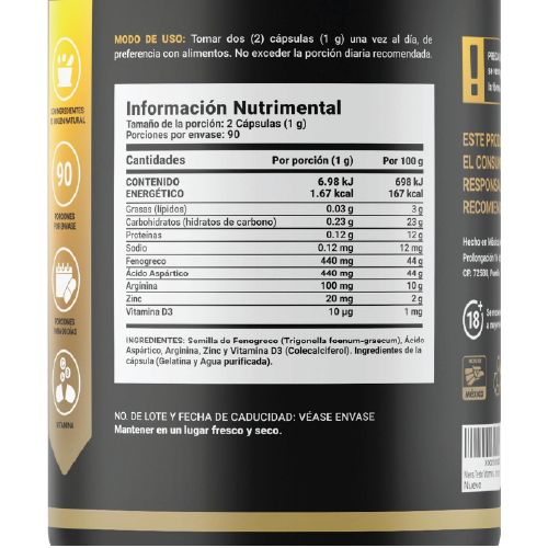 Cada cápsula de 500 mg de nuestro precursor natural contiene una fórmula exclusiva con Fenogreco, Ácido Aspártico, Arginina, Zinc y Vitamina D3, activos aliados de tu rendimiento físico. Esta mezcla selecta de nutrientes sinérgicos se destaca por su exclusividad, ya que ninguna otra presentación la ofrece.