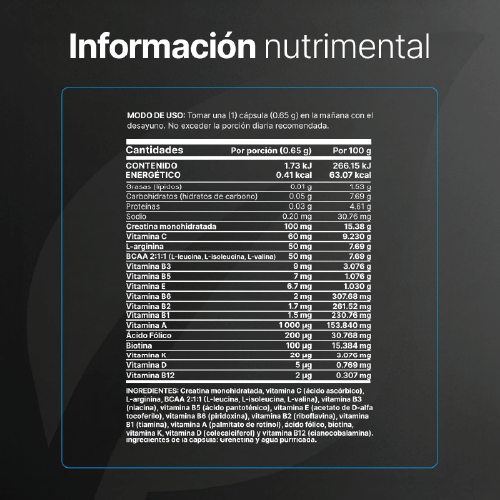 Cada cápsula de 650 mg está diseñada para aportar una potente concentración de Creatina Monohidratada, BCAA 2:1:1 (L-Leucina, L-Isoleucina, L-Valina) y L-Arginina, a diferencia de otras presentaciones que ofrecen únicamente 505 mg. Además de estar enriquecida con Ácido Fólico, Biotina y un increíble Complejo de Vitaminas esenciales para el hombre.