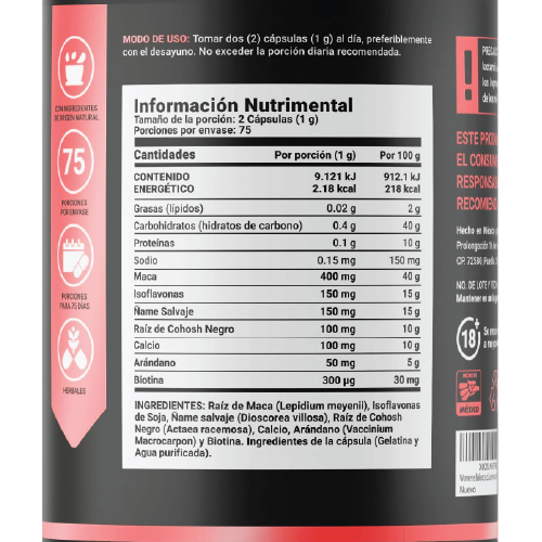 Cada cápsula de 500 mg ofrece una fórmula exclusiva que combina Maca, Isoflavonas, Ñame Salvaje, Raíz de Cohosh Negro, Calcio, Arándano y Biotina, formando una sinergia de ingredientes diseñada para promover el bienestar interior de las mujeres. Esta combinación única no está presente en otras formulaciones.