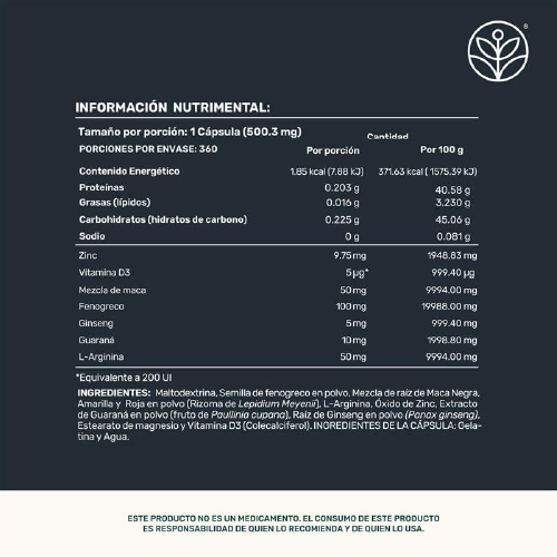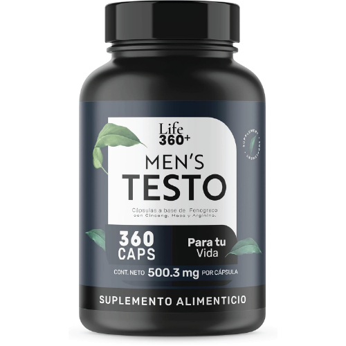 LIFE360+ Mens Testo suplemento en cápsulas contiene maca, vitamina D3, zinc, L-arginina, extracto de ginseng y extracto de guaraná como ingredientes principales dentro de su formulación