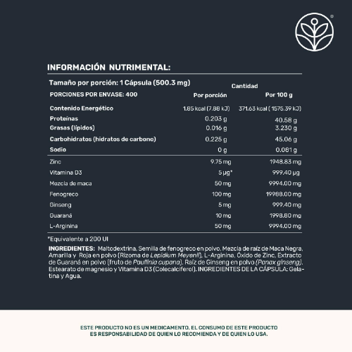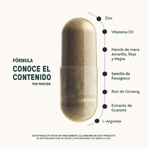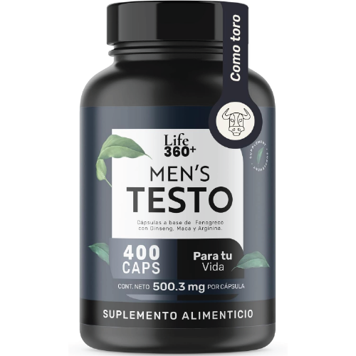 LIFE360+ Mens Testo suplemento en cápsulas que contiene semilla de fenogreco, maca, vitamina D3, zinc, L-arginina, extracto raíz de ginseng y extracto de guaraná como ingredientes principales dentro de su formulación.