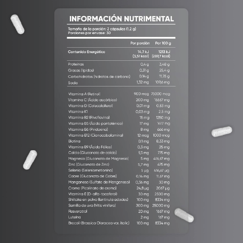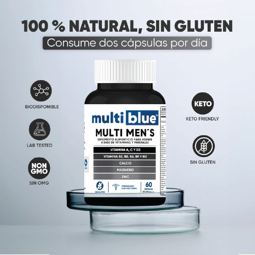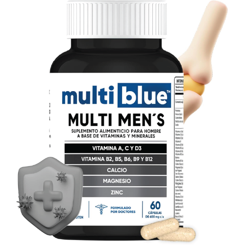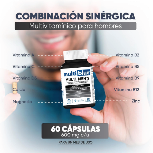 Formulado específicamente para hombres, incluye Vitaminas A, C, D3, B2, B5, B6, B9, B12, junto con minerales esenciales como Calcio, Magnesio y Zinc para un soporte nutricional completo.