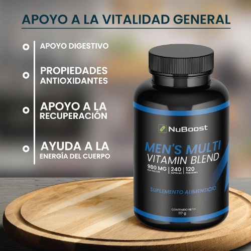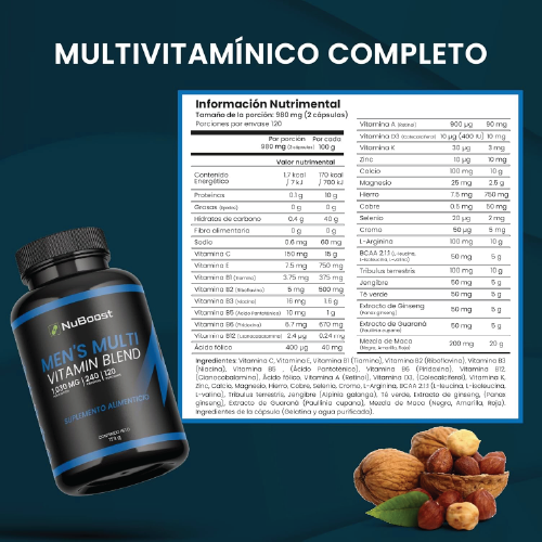 Nuboost Multivitamínico Hombre es una fórmula avanzada diseñada específicamente para hombres que buscan un apoyo diario completo. Este multivitamínico hombre combina una potente mezcla de vitaminas, incluyendo vitamina A, C, E, y todo el complejo B, que son esenciales para cubrir las necesidades diarias del cuerpo masculino.